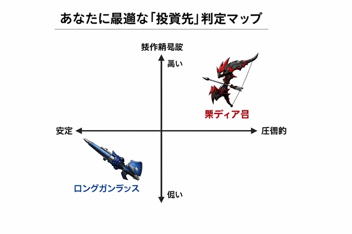 なぜなら、黒ディア弓は最強ですが、操作ミス一つでDPSが激減し、星8モンスターにすら時間切れで負けるリスクがあるからです。私は両方使っていますが、深夜の寝落ち寸前の狩りでも星8を安定して狩れるのはガンランスの方です。自分の「リアルな集中力」を考慮して選ぶのが、社会人の賢い選択です。