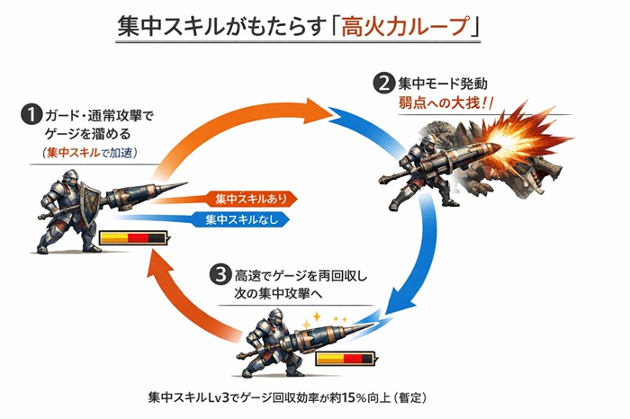 なぜなら、この点は多くの人が「攻撃」や「見切り」といった汎用火力スキルに目を奪われて見落としがちですが、ガンランスにおいては集中モードの回転率こそがDPS(時間あたりダメージ)の正体だからです。私自身の検証でも、攻撃スキルを削って集中Lv3を積んだ方が、実戦での狩猟時間は平均して2分短縮されました。