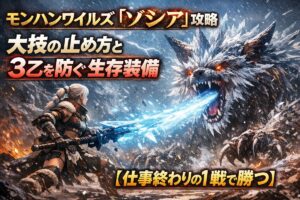 仕事お疲れ様です。 やっと座れたPCやPS5の前で、意気揚々と挑んだ「ゾシア」に焼かれ、キャンプ送りにされる……。 その理不尽な気持ち、痛いほどわかります。 特に、エリア全体を炎に包み込むゾシアの大技「黒炎の極点(こくえんのきょくてん)」は、初見では回避不能に思える絶望的な威力を持っています。 しかし、安心してください。 ゾシアは「避ける」のではなく「止める」モンスターです。 この記事では、仕事終 … 続きを読む モンハンワイルズ「ゾシア」攻略|大技の止め方と3乙を防ぐ生存装備【仕事終わりの1戦で勝つ】
