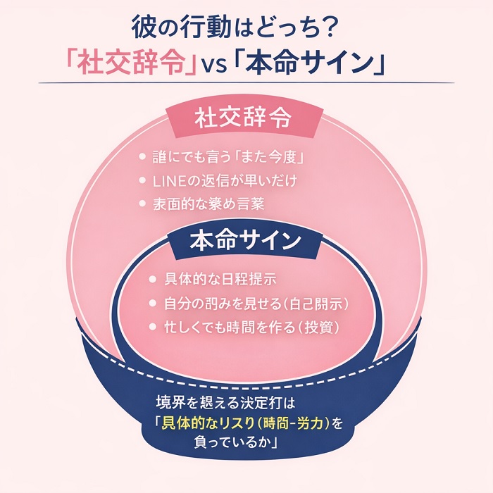 | 項目 | 誰にでも優しい男性(社交辞令) | 本命にだけする特別な行動(本気) |