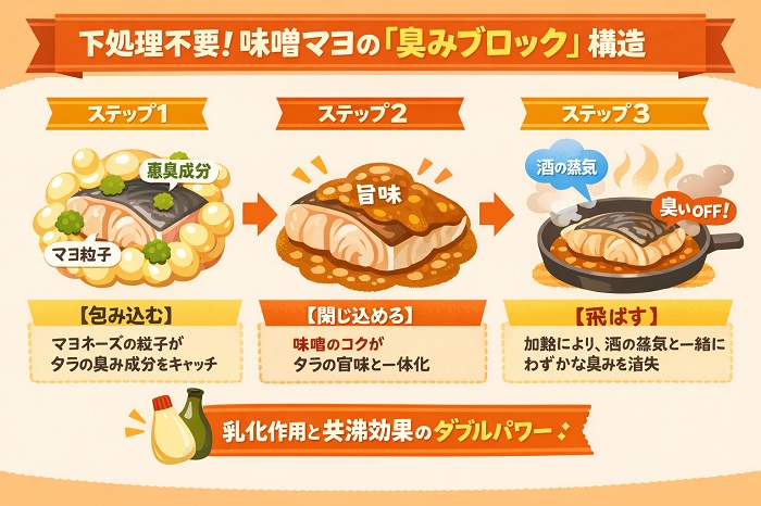 その秘密は、味噌マヨネーズと魚の臭み成分の関係性にあります。