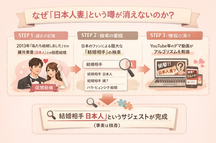 - YouTubeの釣り動画: 再生数を稼ぐために「パク・ヒョンシクが日本人女性と極秘結婚!」といった根拠のないタイトルをつけた動画が一部で拡散されており、それがさらに検索ワードを汚染する原因となっています。