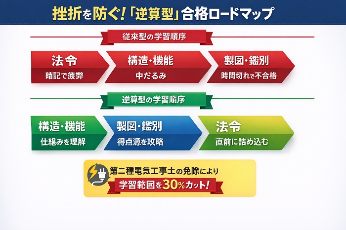 - 第二種電気工事士の免除をフル活用し、学習範囲を絞り込む。
