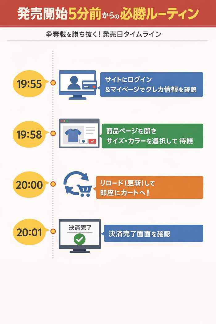 人気アイテムの発売日は、まさに時間との戦いです。以下の手順を事前に済ませておきましょう。