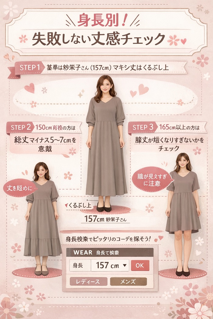 【結論】: 155cm以下の方は、マキシ丈ワンピースよりも「ミニ丈」や「セパレートタイプ」から挑戦するのがおすすめです。