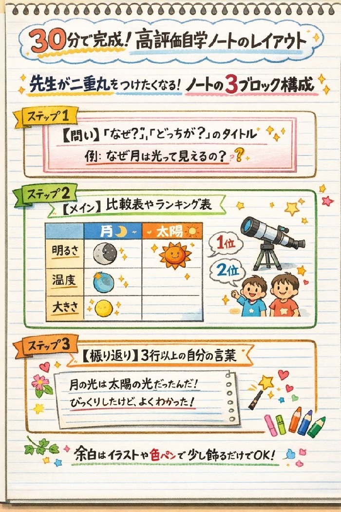 実は、元教員の私から見れば、評価されるノートには共通の「型」があります。