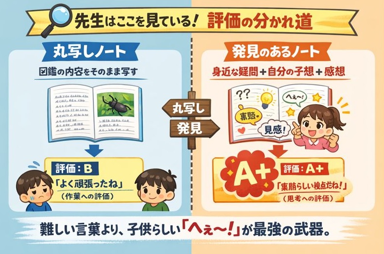逆に、どれだけ時間をかけて図鑑をきれいに丸写ししても、そこに本人の気づきがなければ、評価は「作業」として止まってしまいます。
