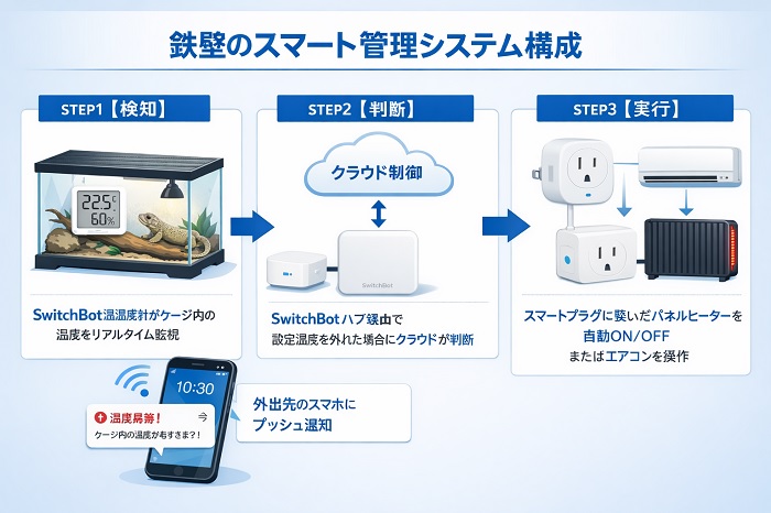 現代の爬虫類飼育において、「虫を一切見ない・触らない」ことと、「スマホ一台で24時間環境を自動管理する」ことは、どちらも完全に可能です。