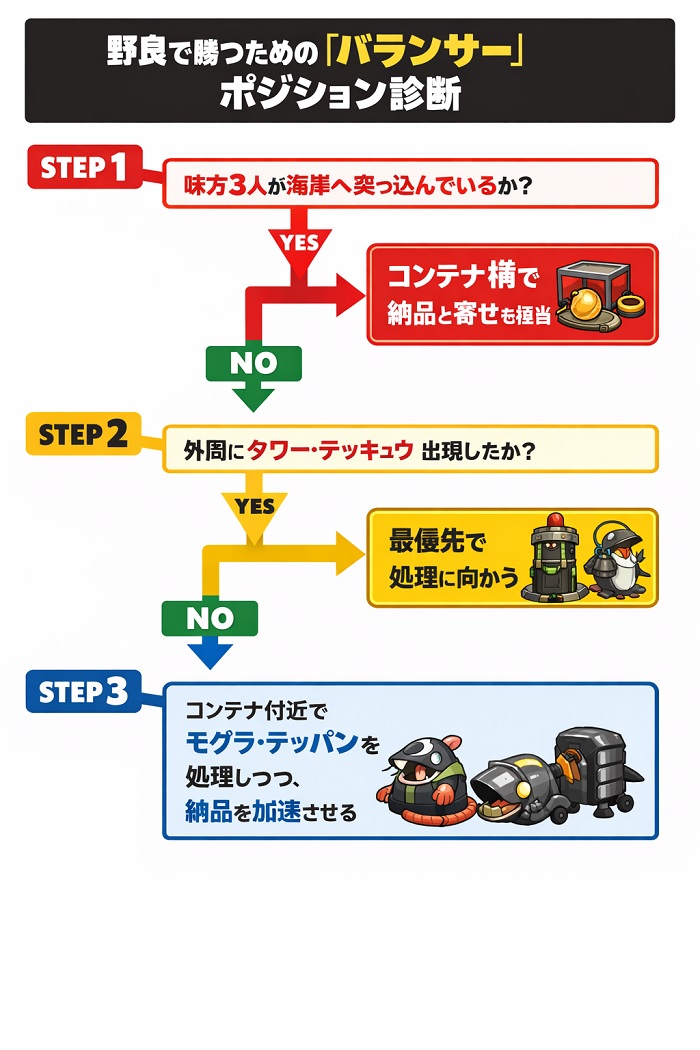 A: 納品よりも「味方の蘇生」を最優先してください。ただし、直接助けに行くと自分もデスする危険がある場合は、ボムを投げるか、スペシャル(特にナイスダマやトリプルトルネード)を使って遠隔で蘇生させます。バランサーにとって、「全滅(Game Over)を回避すること」が最大の使命です。