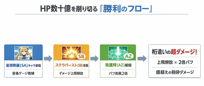 つまり、「SAキャラが起点となり、SBを発動させ、AZによる超倍率バフを乗せて、上限突破ダメージで粉砕する」。