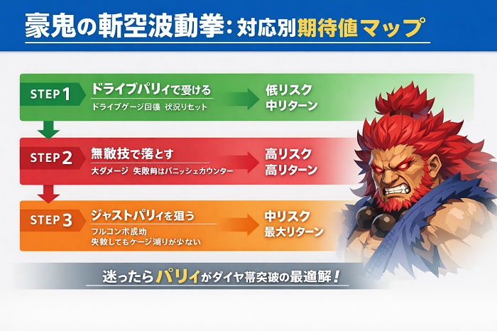 ここで重要なのは、期待値の計算です。豪鬼の斬空波動拳に対して闇雲にボタンを押すのではなく、「ドライブパリィ」で受け流してドライブゲージを回復させる、あるいは「ジャストパリィ」を狙ってターンを強制的に奪うという選択肢を固定化してください。