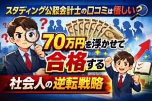 [著者情報] 田中 賢治(社会人合格戦略コンサルタント) 働きながら3年で公認会計士試験に合格。かつて大手予備校の受講料70万円を支払いながら、仕事との両立ができず挫折した経験を持つ。その失敗を糧に、オンライン講座と大手単科を組み合わせた「ハイブリッド学習法」を確立。現在は、予算と時間に制約のある社会人受験生へ、綺麗事抜きの合格戦略を伝授している。 「公認会計士になりたい。でも、予備校代の70万円 … 続きを読む スタディング公認会計士の口コミは怪しい?70万円を浮かせて合格する社会人の逆転戦略
