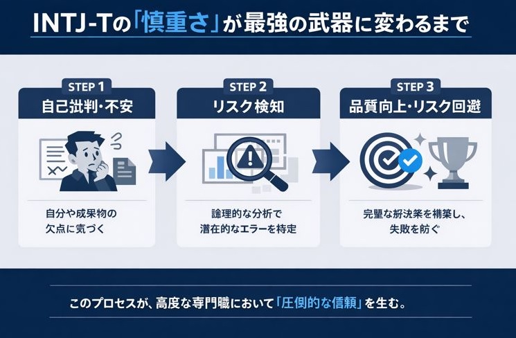 しかし、プロフェッショナルの現場において、INTJ-Tの「慎重さ」は、Assertive(自己主張型)には到達できない「究極のリスク管理能力」へと昇華されます。