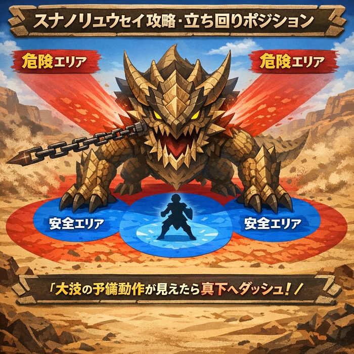 スナノリュウセイとの戦いでクエスト失敗を繰り返してしまう場合、多くのハンターが無意識に「スナノリュウセイが最も得意とする距離」で戦わされています。