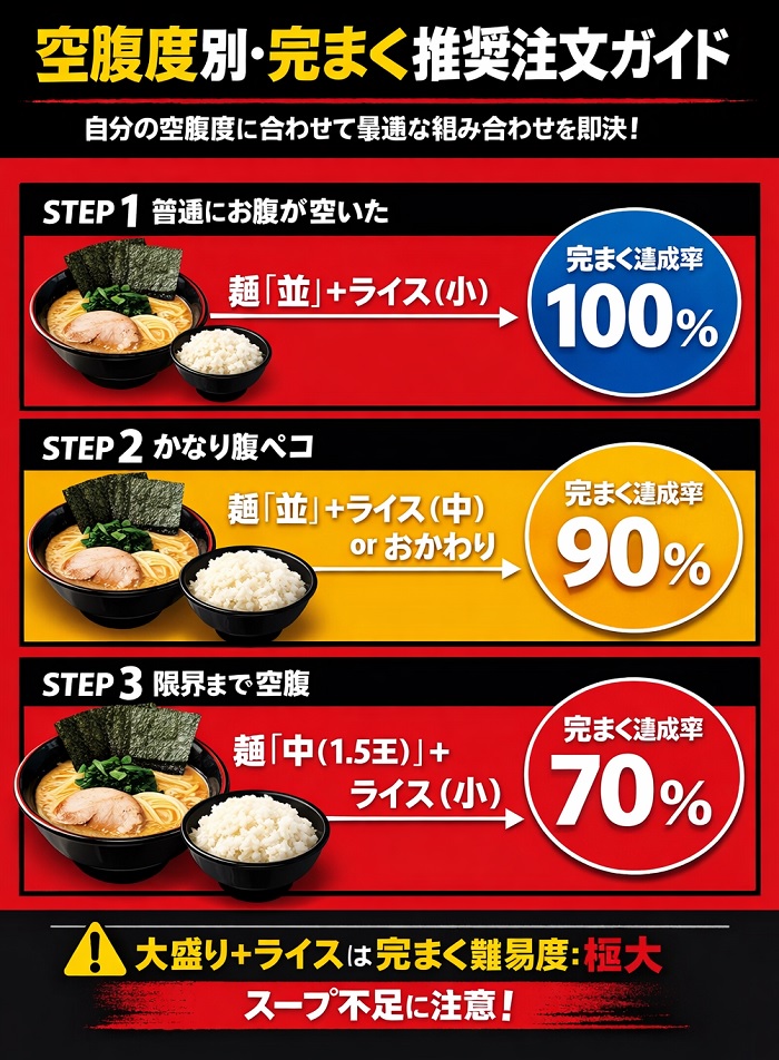 - 完まくを100%成功させたいなら: 麺「並」+ライス