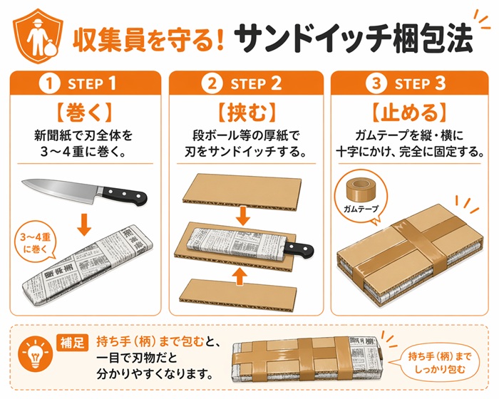 収集員の安全を物理的に守るための最も確実な手段が、私が推奨する「サンドイッチ梱包法」です。