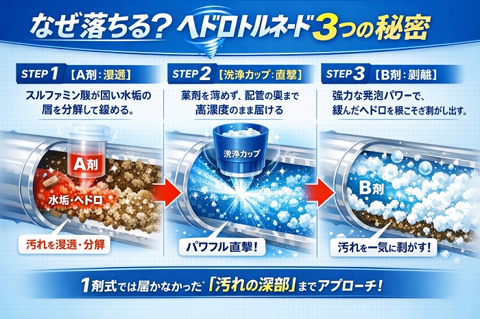 しかし、「A剤(酸性)で緩め、B剤(アルカリ)で剥がす」というヘドロトルネードの2剤式アプローチなら、業者レベルの洗浄が自宅で可能です。