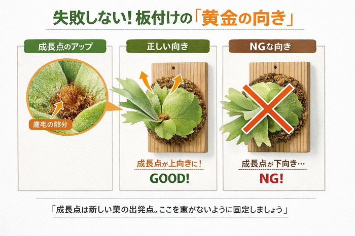 - 固定: テグス(釣り糸)やビニール紐を使い、成長点を傷つけないように注意しながら、貯水葉の縁を抑えるように板に巻き付けて固定します。