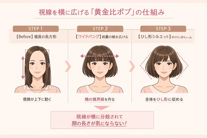 面長さんのボブを成功させるための絶対ルール、それは「視覚的な縦横比を1:1に近づけること」です。
