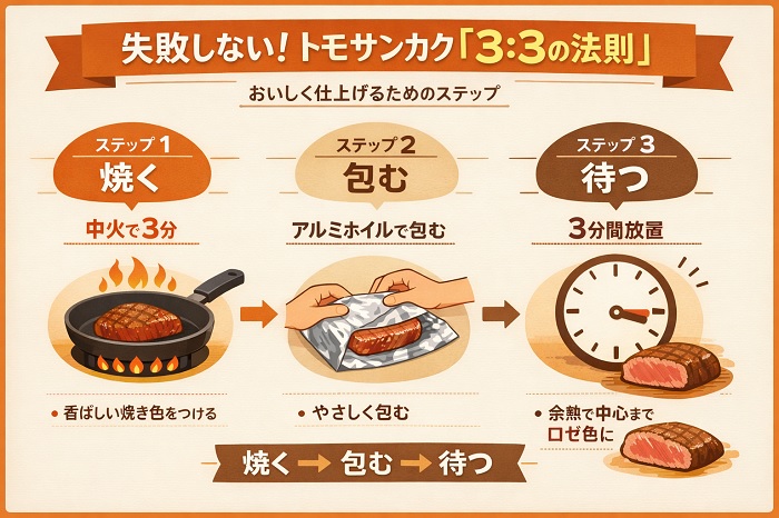 家庭のフライパンでトモサンカクのポテンシャルを120%引き出すための、具体的かつシンプルな解決策が「3:3の法則」です。