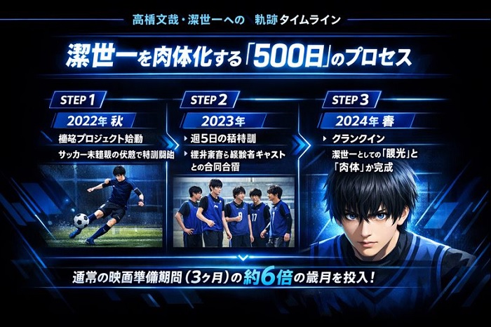 髙橋文哉さんと1.5年のトレーニングの関係性は、単なる「練習」ではなく、潔世一が「青い監獄(ブルーロック)」でゼロから成長していく過程そのものを肉体でなぞる行為だったと言えます。