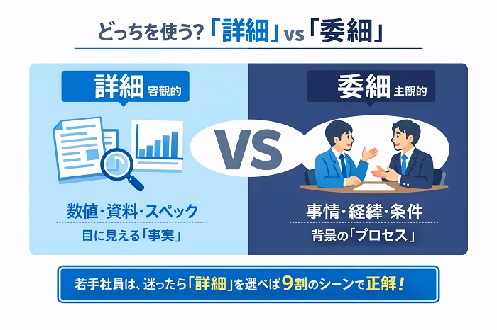 「委細」と「詳細」はどちらも「詳しいこと」を指しますが、その対象となる「中身」に明確な違いがあります。