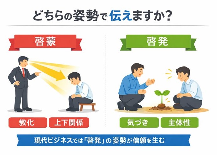 つまり、「啓発」は相手の主体性を尊重し、気づきを促すというニュアンスを含んでいるのです。