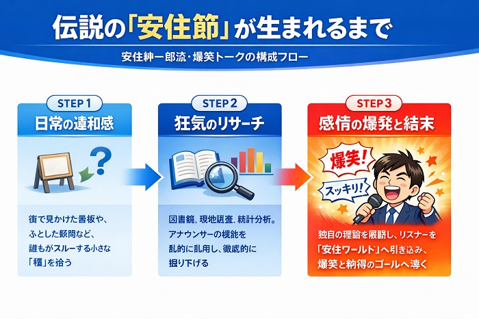 安住紳一郎氏のラジオでの凄みは、日常の些細な観察から、誰も予想だにしない狂気的な深掘りへと展開するトーク構成にあります。