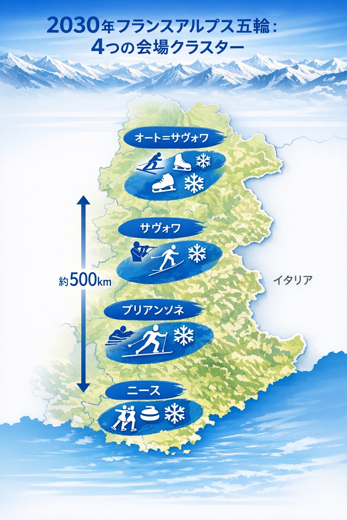 結論から申し上げれば、2030年フランスアルプス五輪は、新設施設をほぼ作らず、広大なアルプス全域の既存施設をネットワーク化する「広域分散型モデル」の完成形です。