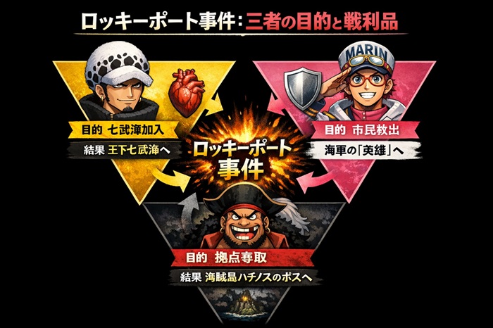 実は、このロッキーポート事件こそが、最終章の舞台である「海賊島ハチノス」の運命を決定づけ、ロー、コビー、そして黒ひげという3人の重要人物の地位を確立させた、物語の分岐点とも言える大事件だったのです。