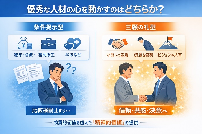 現代のビジネス、特に優秀な人材の獲得競争が激しい採用シーンにおいて、「三顧の礼」という姿勢は、競合他社に差をつける最強の武器になります。