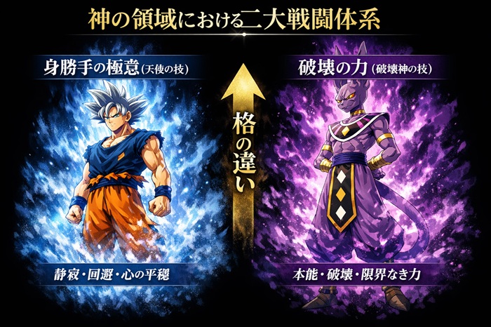 孫悟空の「身勝手の極意」とビルスの「破壊の力」は、天使の技(静)と破壊神の技(動)という対照的な関係にあります。