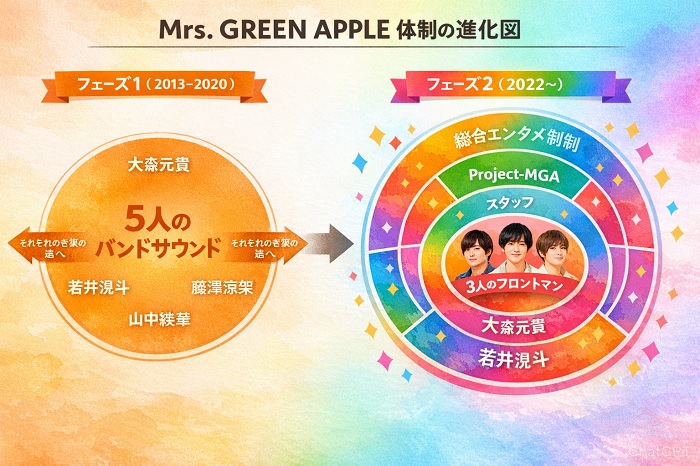 なぜなら、この点は多くの人が見落としがちですが、フェーズ2のMrs. GREEN APPLEは「Project-MGA」という世界進出を見据えた巨大な組織へと進化しており、求められる役割がフェーズ1の「バンドマン」から「総合エンターテイナー」へと劇的に変化したからです。この変化に対して、5人がそれぞれの幸せを優先して出した答えが、今の3人体制なのです。
