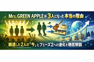 「ダンスホール」や「ケセラセラ」をきっかけにMrs. GREEN APPLE(ミセス・グリーン・アップル)を好きになった皆さん、ようこそ。 今の3人が放つ圧倒的なキラキラ感に魅了されていると、過去のミュージックビデオを見て「あれ、昔は5人だったの?」と驚くこともあるかもしれません。 ネットで検索すると「不仲」や「脱退」といった少し不安になる言葉も出てきますが、安心してください。 Mrs. GREE … 続きを読む Mrs. GREEN APPLEが3人になった本当の理由|脱退した2人の「今」とフェーズ2への進化を徹底解説