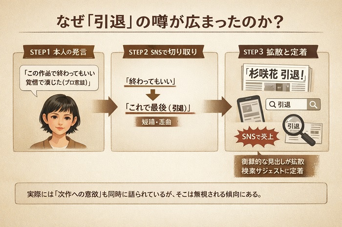 具体的には、杉咲花さんが過去に「俳優を辞めたいと思っていた時期があった」と告白したエピソードが、文脈を無視して「現在も辞めたがっている」かのように歪められて拡散されたのです。