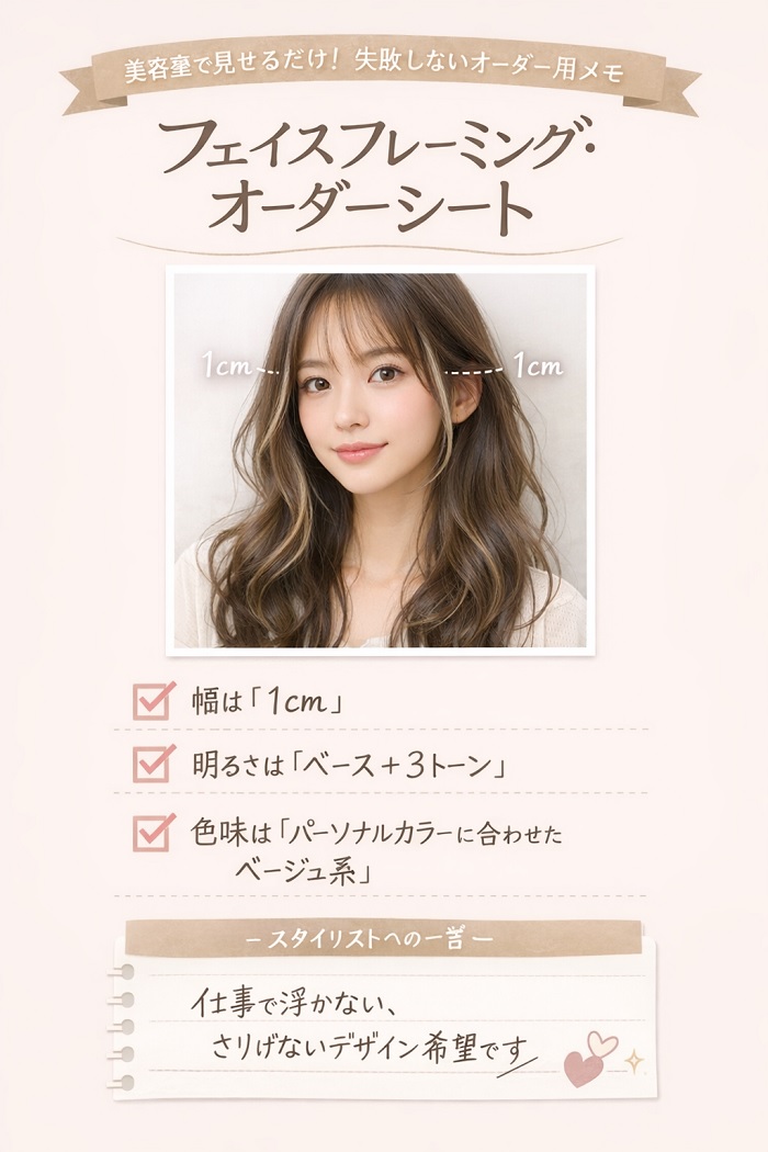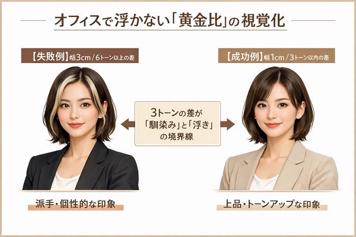 オフィスワーカーがフェイスフレーミングで成功する鍵は、「顔周り1cmの幅」と「ベースの髪色との差を3トーン以内」に抑えるという2つの黄金比を守ることです。