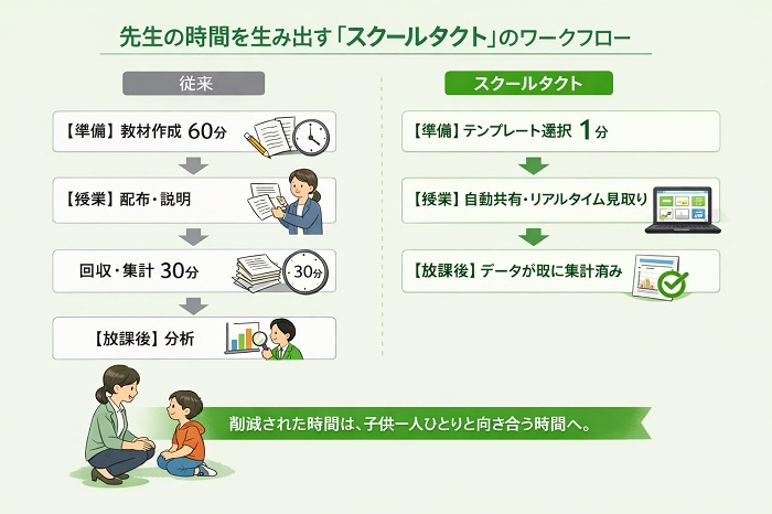 授業支援システム「スクールタクト」は、先生の準備時間を増やすツールではありません。