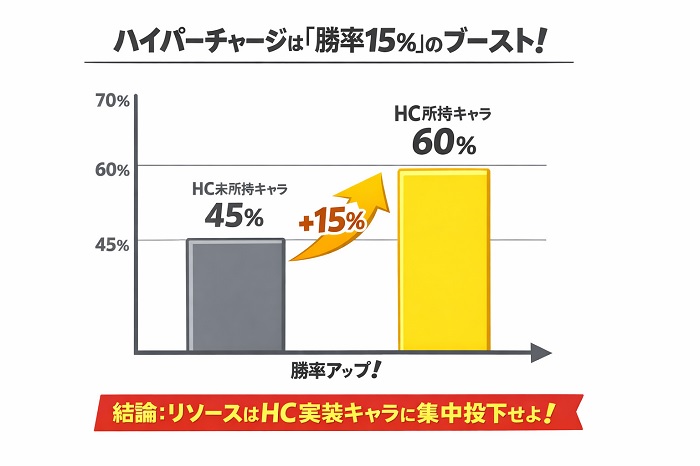 統計データサイト『Brawl Time Ninja』のグローバル勝率データによれば、ハイパーチャージを所持しているプレイヤーの勝率は、未所持のプレイヤーに対して平均15%以上高いという明確な正の相関が示されています。