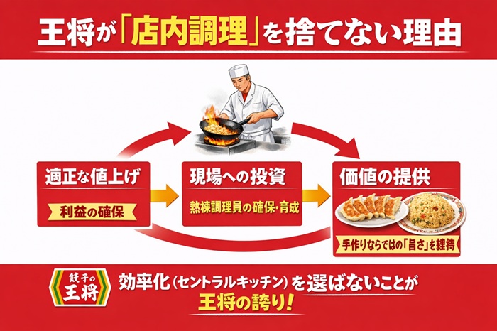 多くの競合チェーンが、工場で調理したものを店舗で温めるだけの「セントラルキッチン方式」を採用し、効率化とサービス均一化を進める中で、王将は今もオープンキッチンでの調理にこだわっています。