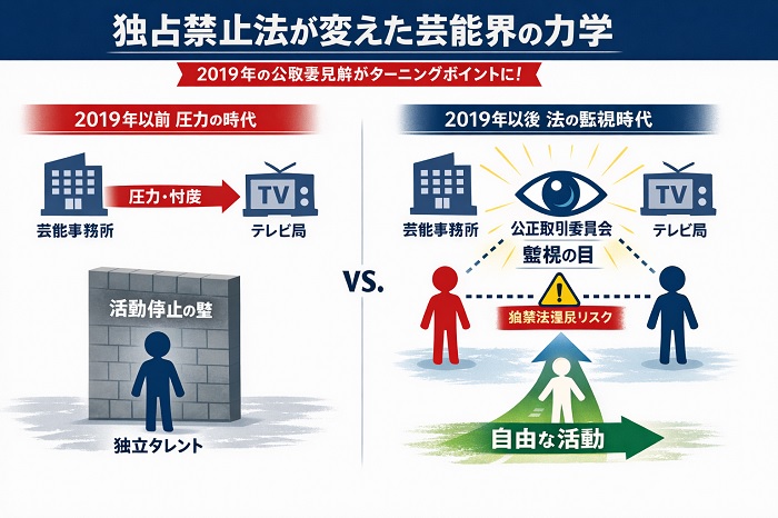 2019年、公正取引委員会は「芸能事務所が独立したタレントの活動を妨害することは、独占禁止法上の『優越的地位の乱用』に当たる可能性がある」との見解を公式に示しました。