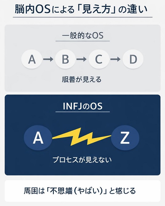 多くの人が「A→B→C」と階段を上るように論理を組み立てるのに対し、INFJは「A」という情報を受け取った瞬間、無意識のうちに過去の膨大なパターンと照合し、いきなり「Z」という結論を導き出します。