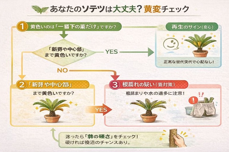 しかし、ソテツは非常に強健な植物です。大切なのは、その黄変が「自然な世代交代」なのか「危険なSOS」なのかを見極めることです。