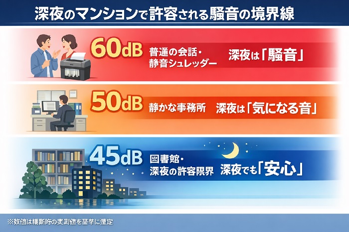 では、深夜のマンションでも「合格」と言える基準はどこにあるのでしょうか。