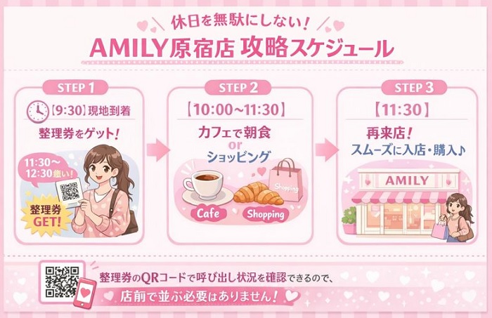 なぜなら、AMILYの店舗前は非常に混雑しており、その場で待機するのは体力的にも時間的にもロスが大きいからです。整理券システムを「拘束」ではなく「自由時間」と捉え直すことで、原宿観光のタイパは劇的に向上します。