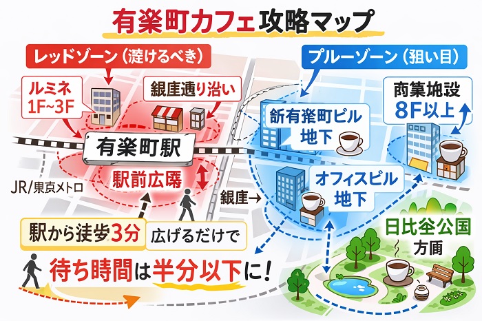 ルミネ有楽町の低層階や駅直結のカフェは、最も人の目に触れやすいため、混雑のピークが最大化する「地雷エリア」です。