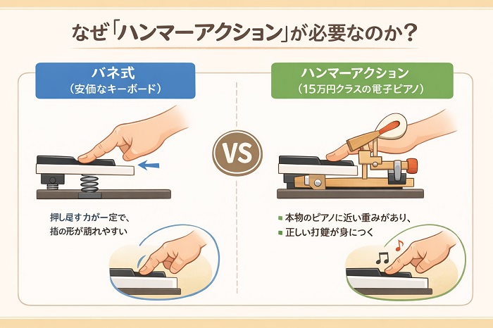 なぜなら、この視点を持つことで、単なる価格の安さではなく「鍵盤の構造(ハンマーアクション)」に予算をかけるべきだという判断基準が明確になるからです。多くの親御さんが「音色の多さ」に目を奪われがちですが、上達に直結するのは「鍵盤の質」一点に尽きます。