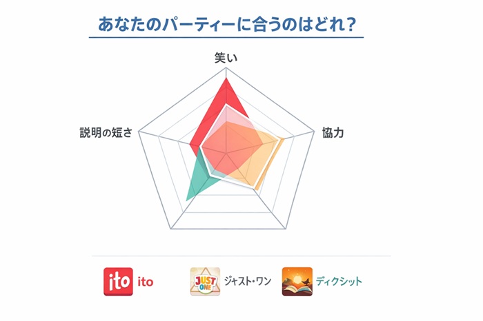 【結論】: パーティー用のゲームを選ぶ際は、パッケージの裏を見て「対象年齢」よりも「ルール説明が何分で終わるか」を最優先してください。
