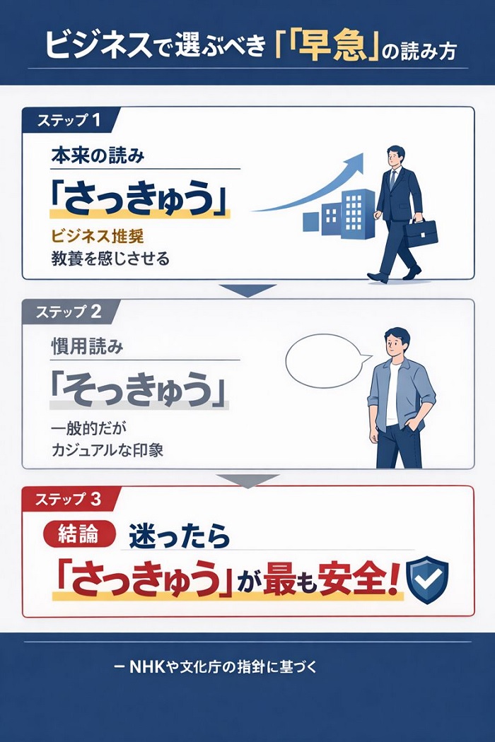 ここで重要なのは、「さっきゅう(本来の読み)」と「そっきゅう(慣用読み)」は、ビジネスシーンにおいて使い分けるべき競合関係にあるということです。