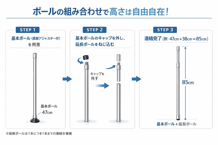 - ゴミ箱の上を活用したい場合: 47cmの基本ポール + 38cmの延長ポール = 約85cm