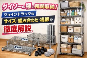 「冷蔵庫の横にあと15cmの隙間があるのに、ちょうどいい棚が見つからない……」 「既製品の隙間ワゴンは5,000円以上するし、失敗したらもったいない……」 そんな悩みをお持ちではありませんか? 実は、ダイソーの「ジョイントラック」を活用すれば、あなたの家の隙間に1cm単位で高さを調整できる理想の棚が、わずか1,000円〜2,500円ほどで完成します。 この記事では、100均収納専門家の私が、ダイソ … 続きを読む ダイソーの棚で隙間収納!ジョイントラックのサイズ・組み合わせ・総額を徹底解説